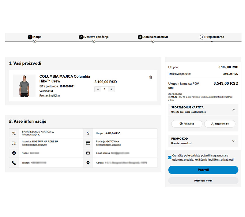 Nakon unosa podataka, potrebno je da pređete na sledeći korak gde možete videti pregled korpe i potvrditi porudžbinu (Slika 8).